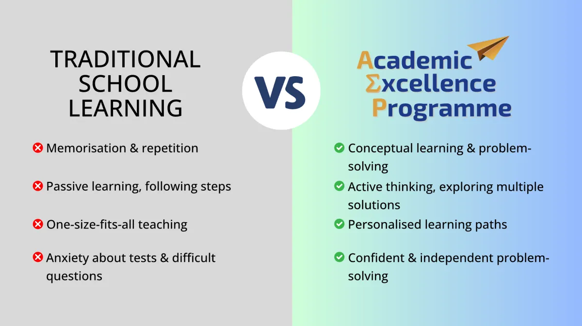 Unlike traditional tuition, which focuses on repetition and drills, AEP teaches students to think critically, identify patterns, and apply concepts to real-world problems.